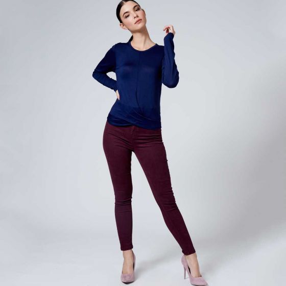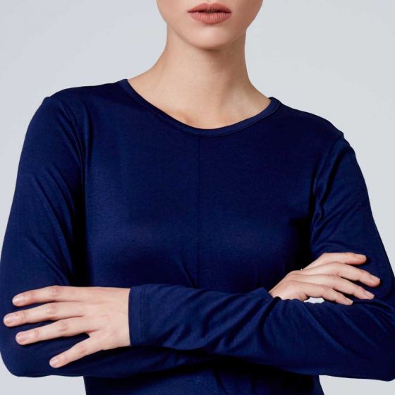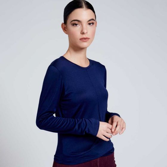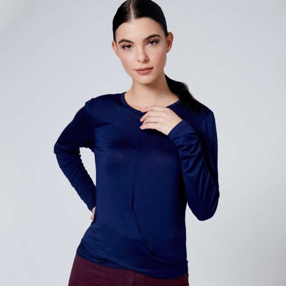 Blusa estilo casual marca KAFE con frente tipo cerrado, cuello redondo y manga larga color azul.